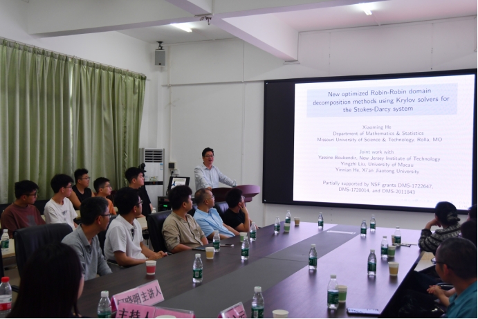 邀请,美国密苏里科技大学何晓明教授莅临湖光校区明德楼A座405会议室,为美女av师生作了题为“New optimized Robin-Robin domain decomposition methods using Krylov solvers for the Stokes-Darcy system”的专题学术报告。报告会由美女av院长彭小红教授主持,相关专业师生代表50余人到场聆听、交流。